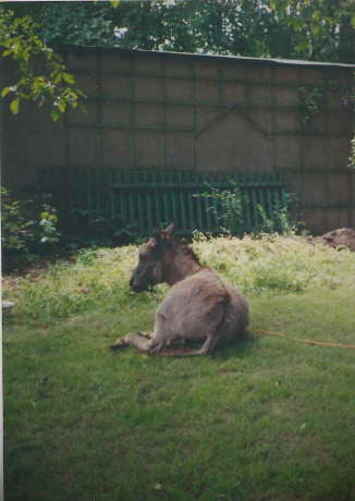 Eigentlich ein seltenes Bild. Wie auch Pferde legen sich Esel nur in absoluter Sicherheit hin, es sei denn sie sind krank. Hier war es Erschöpfung, am Tag zuvor hatten wir eine Gartenparty und er war zu neugierig um zu schlafen.